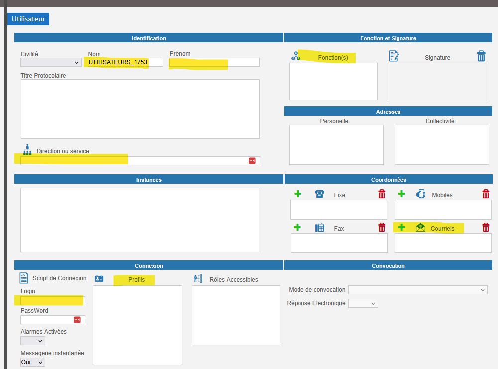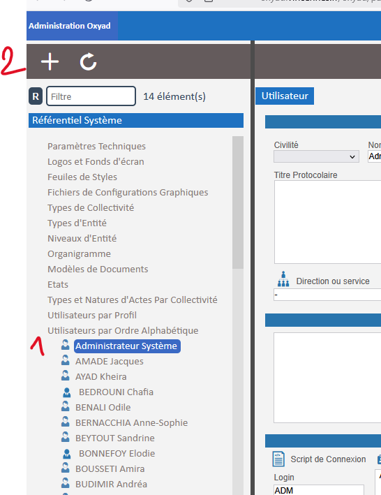 Dans le menu Utilisateurs par ordre alphabétique : Cliquer sur n'importe quel utilisateur pour afficher le bouton "+" permettant de créer la fiche :