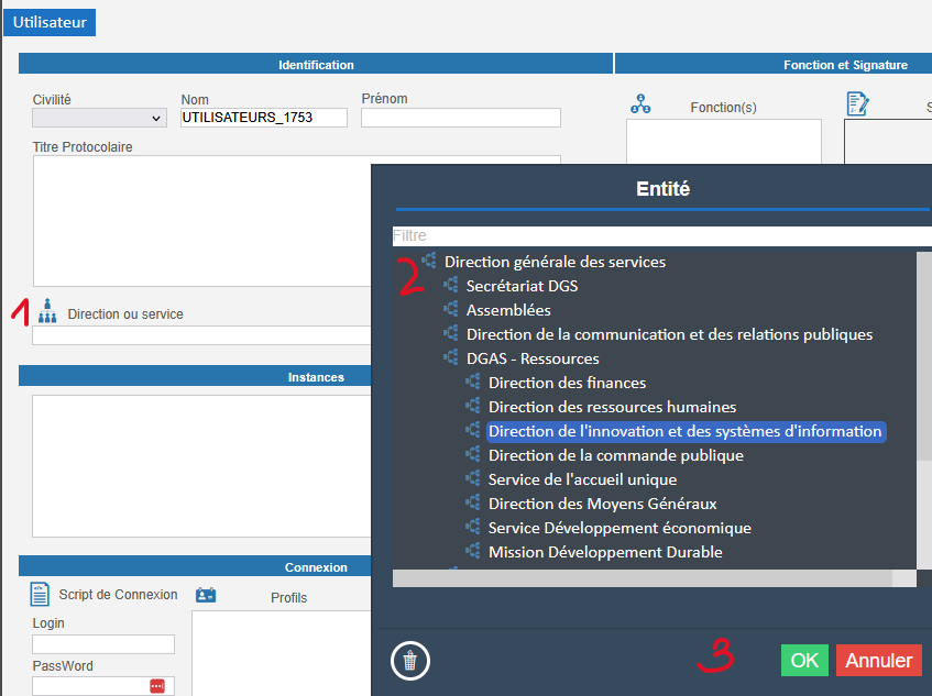 - l’entité en dépliant les niveaux de l’organigramme jusqu'à l'entité de la personne :
